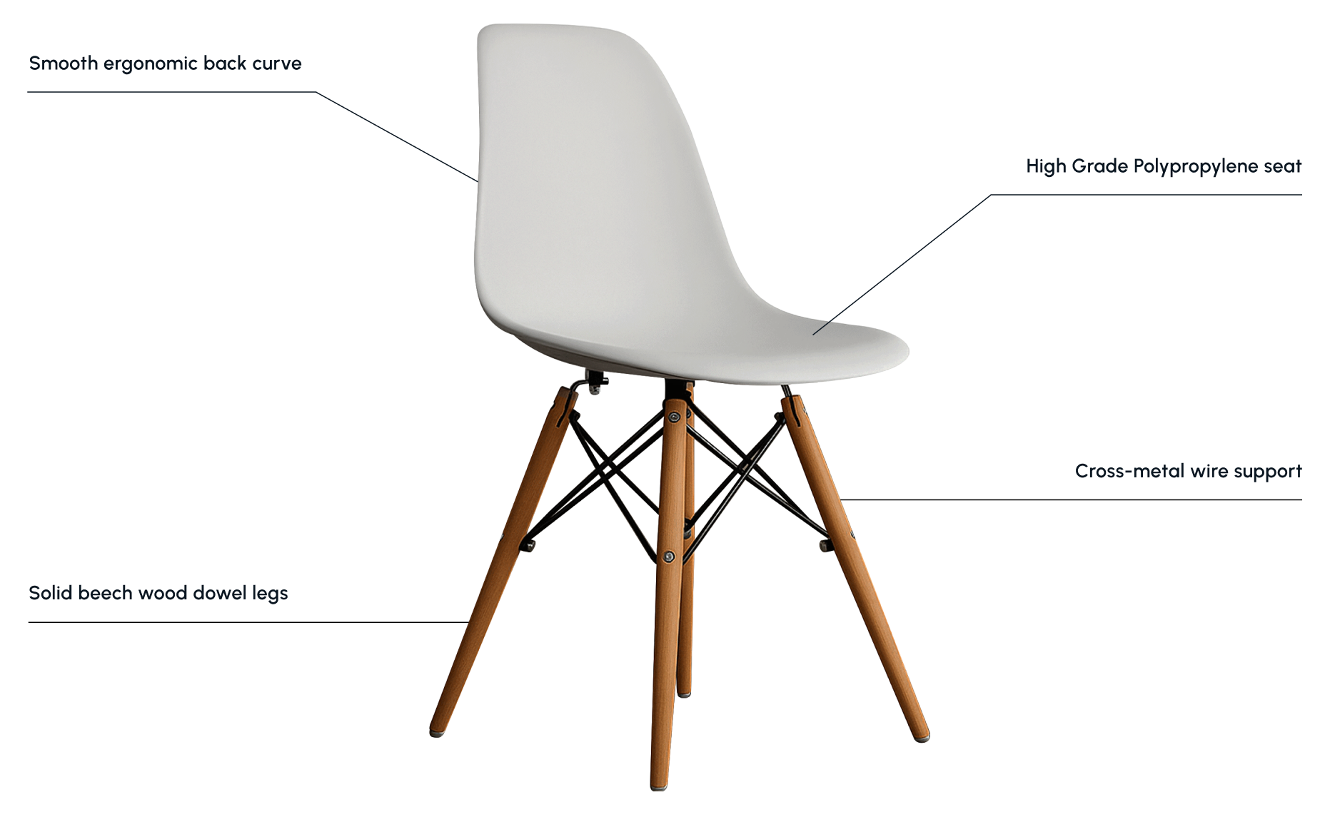 DSW stands for Dining Side Wood, describing its side chair shell mounted on a wooden dowel base with steel cross supports.
